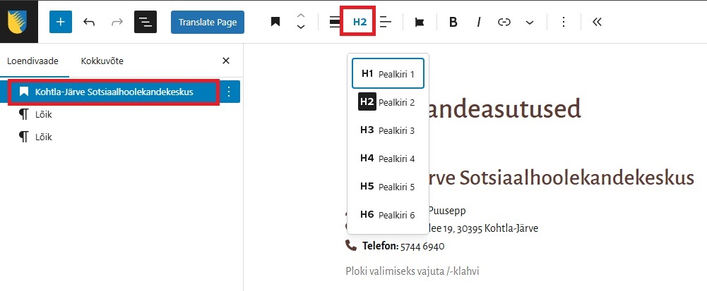 - Vali pealkirja tase (H2, H3 jne).